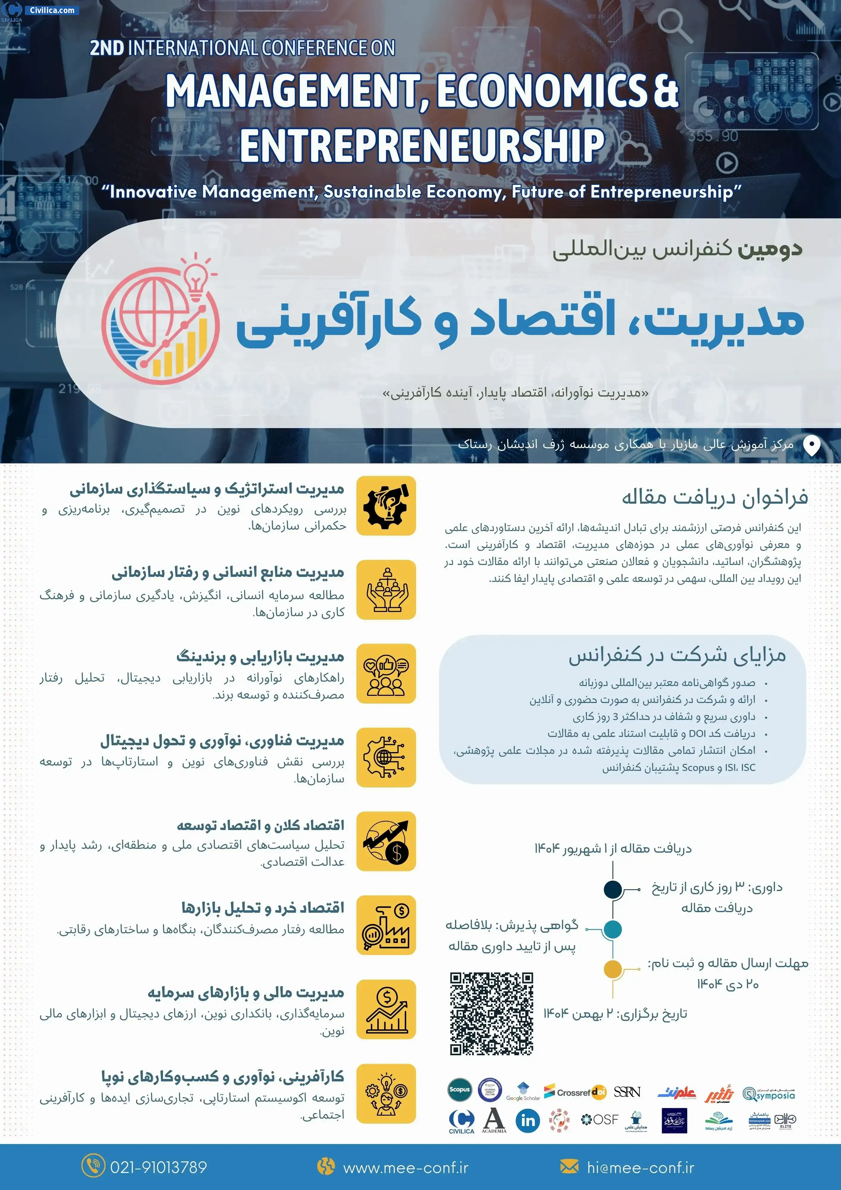 2nd International Conference on Management, Economics and Entrepreneurship In date 2026-01-22 by Maziar University,ژورف اندیشان رستاک in City Nur will be held.Since the conference held officially, all of this Conference paper and proceedings will be indexed in the Civilica database and Iranian Consortium of National Content (ICNC) and you can have full confidence.