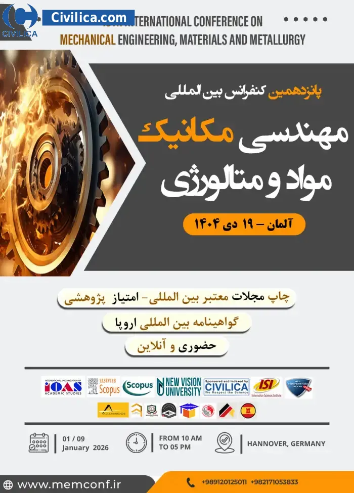 15th International Conference On Mechanical Engineering, Materials and Metallurgy In date 2026-01-09 by ,سازمان بین المللی مطالعات دانشگاهی will be held.Since the conference held officially, all of this Conference paper and proceedings will be indexed in the Civilica database and Iranian Consortium of National Content (ICNC) and you can have full confidence.