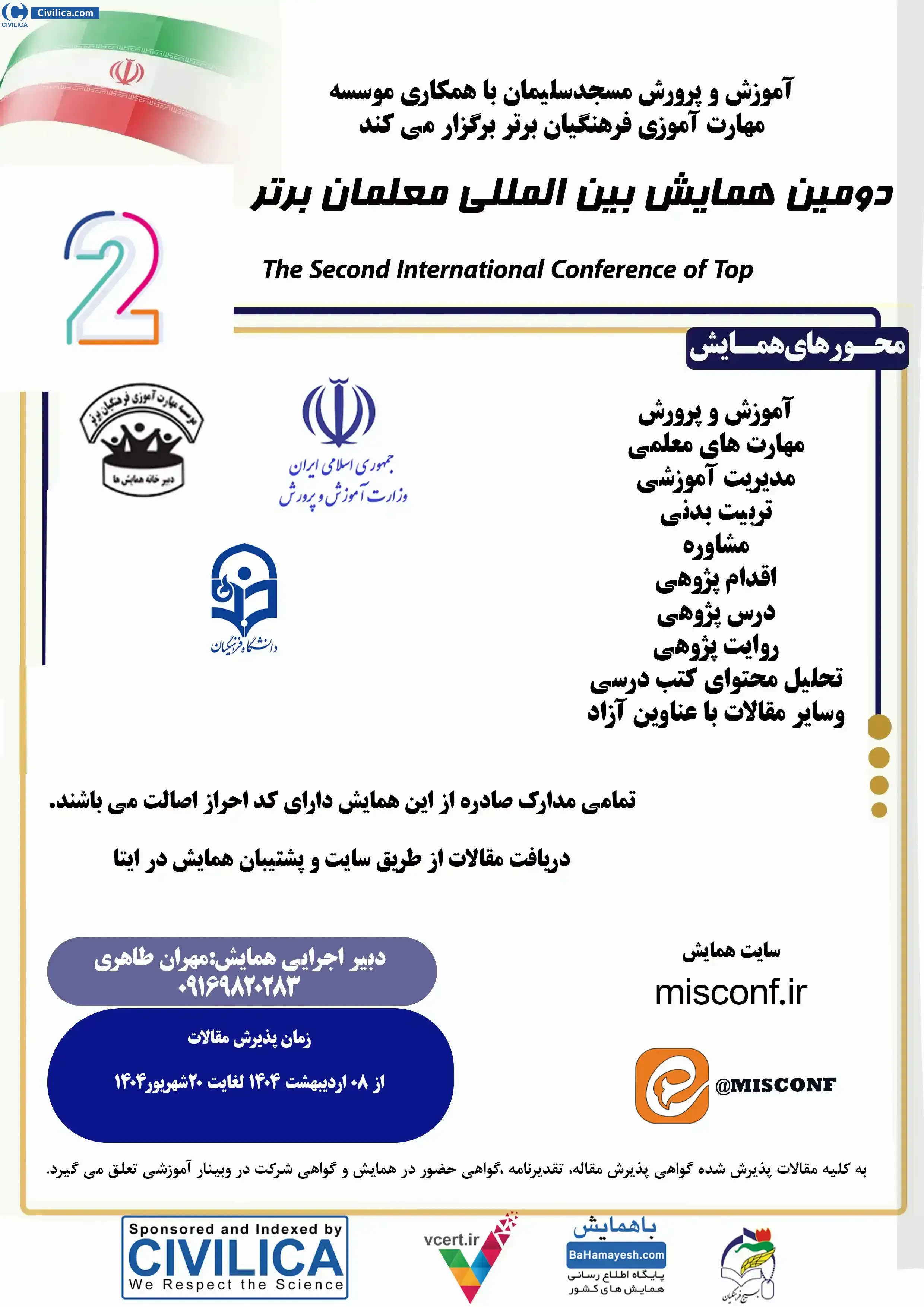 The Second International Conference of Top Teachers In date 2025-09-11 by ,آموزش و پرورش مسجدسلیمانموسسه مهارت آموزی فرهنگیان برتر in City Masjed Soleyman was held. please refer to the following link to download all the papers of conference proceedings: Proceedings The Second International Conference of Top Teachers