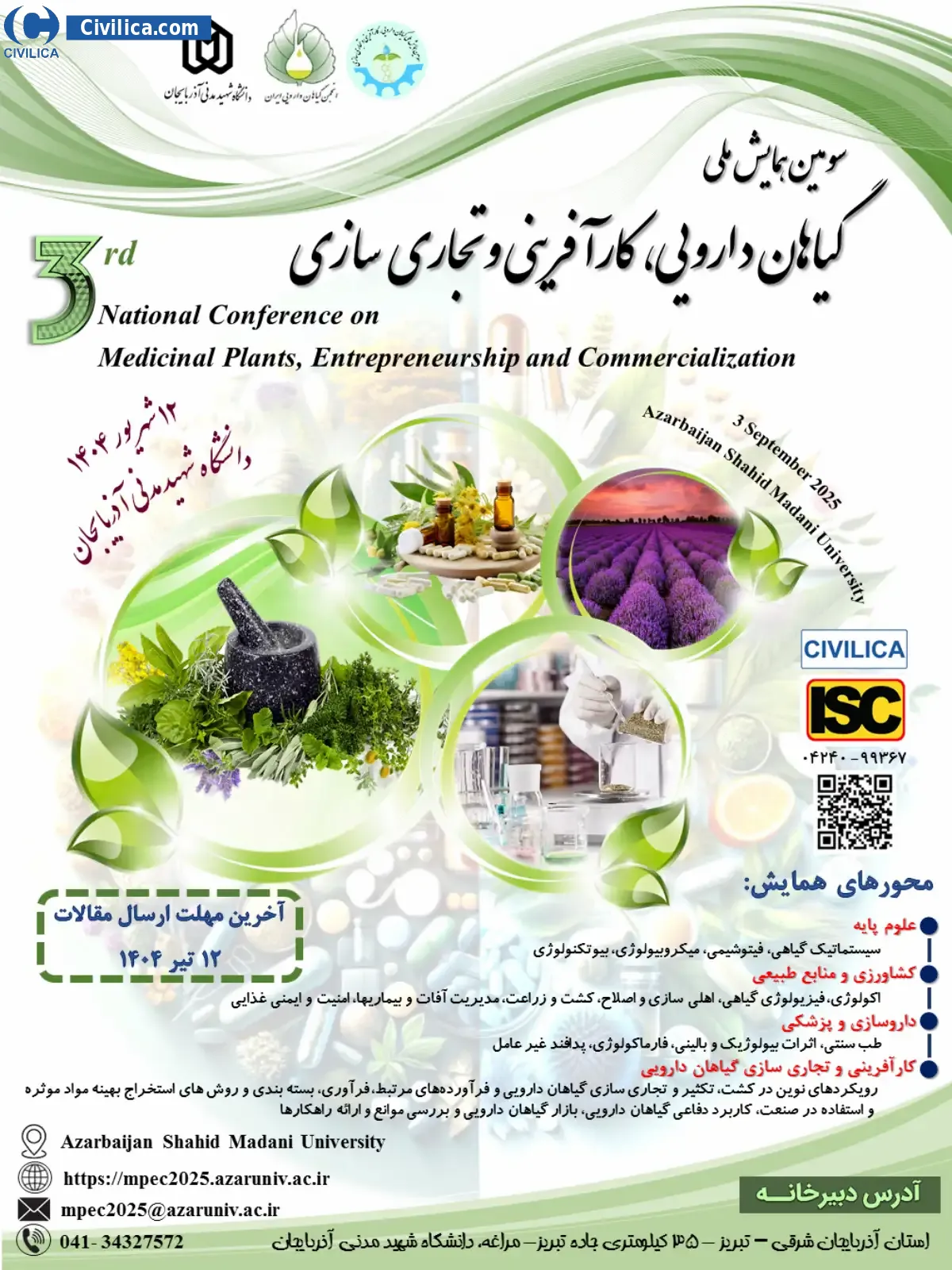 third National Conference on Medicinal Plants, Entrepreneurship and Commercialization In date 2025-09-03 by Azarbaijan Shahid Madani University,Iranian Society of Medicinal Plants in City Tabriz was held. please refer to the following link to download all the papers of conference proceedings: Proceedings third National Conference on Medicinal Plants, Entrepreneurship and Commercialization