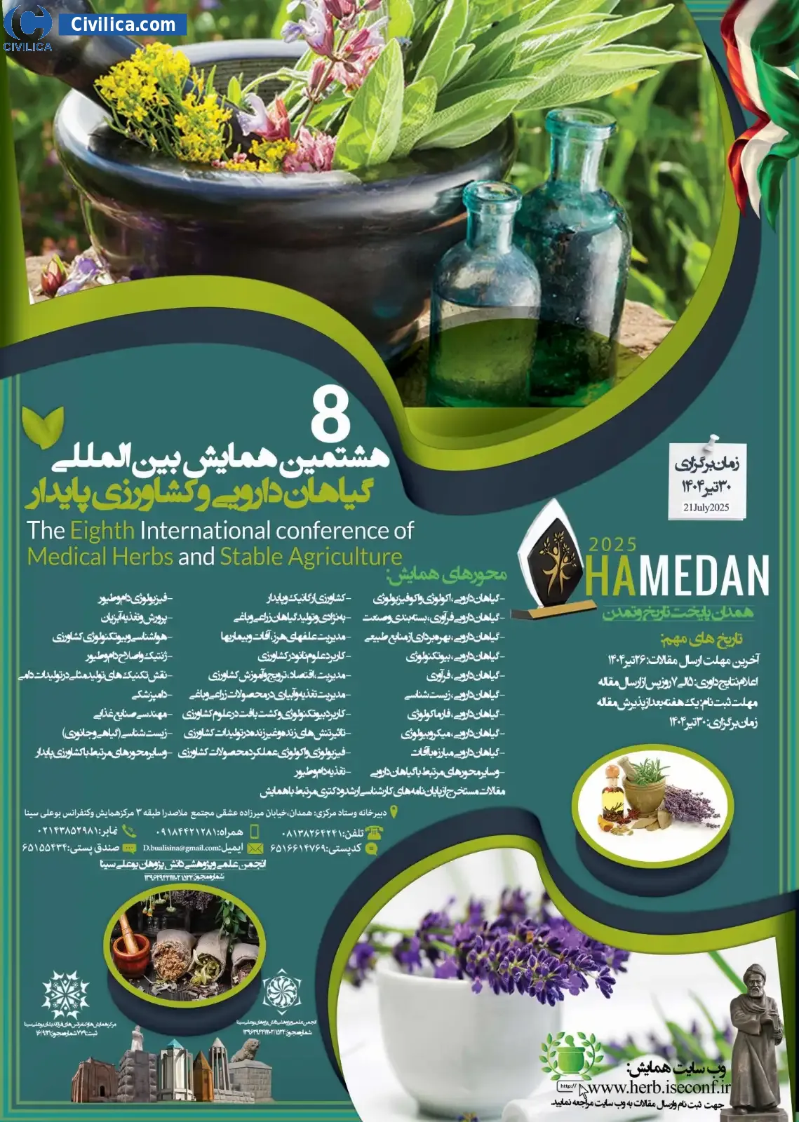 The Eighth International conference of Medical Herbs and Stable Agriculture In date 2025-07-21 by ,مرکزهمایش ها و کنفرانس های بوعلی سینا، انجمن علمی دانش پژوهان بوعلی سینا in City Hamadan was held. please refer to the following link to download all the papers of conference proceedings: Proceedings The Eighth International conference of Medical Herbs and Stable Agriculture
