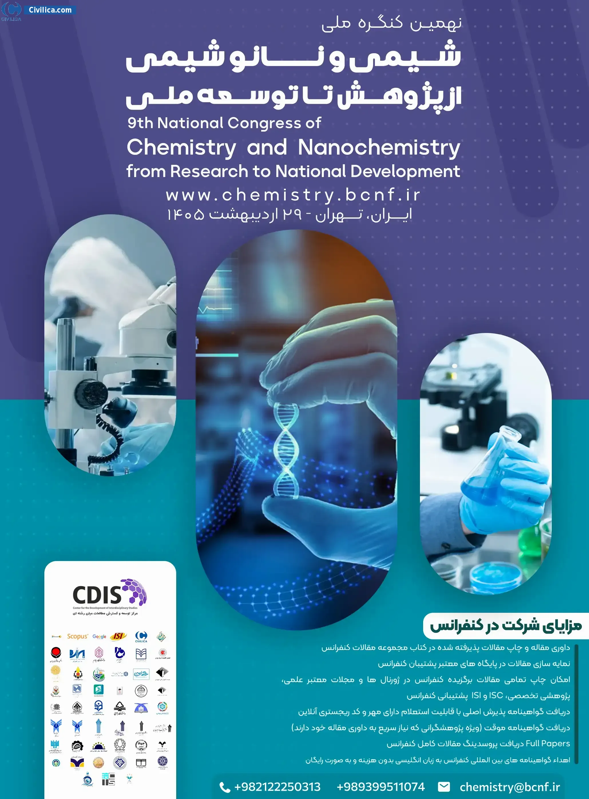 Ninth National Congress of Chemistry and Nanochemistry from Research to National Development In date 2026-05-19 by ,مرکز توسعه و گسترش مطالعات میان رشته ای in City Tehran will be held.Since the conference held officially, all of this Conference paper and proceedings will be indexed in the Civilica database and Iranian Consortium of National Content (ICNC) and you can have full confidence.