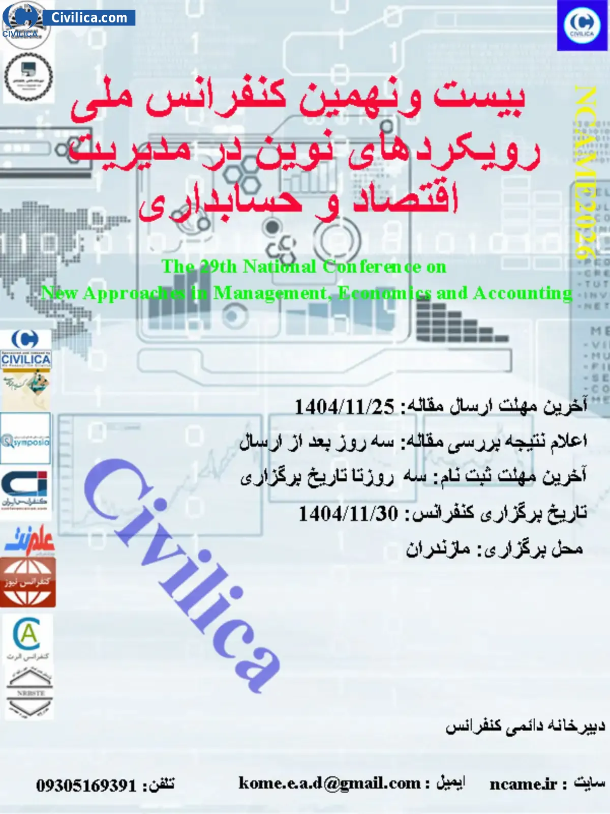 The 29th National Conference on New Approaches in Management, Economics and Accounting In date 2026-02-19 by ,گروه علمی علم آوران دانش in City Babol will be held.Since the conference held officially, all of this Conference paper and proceedings will be indexed in the Civilica database and Iranian Consortium of National Content (ICNC) and you can have full confidence.