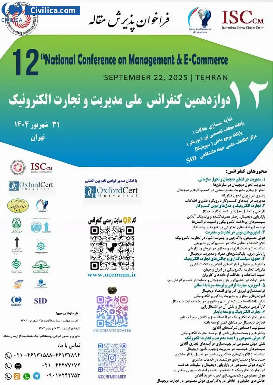 12th National Conference on Management and E-Commerce In date 2025-09-22 by ,موسسه پژوهشی مدیریت مدبر با مشارکت مجامع علمی in City Tehran was held. please refer to the following link to download all the papers of conference proceedings: Proceedings 12th National Conference on Management and E-Commerce