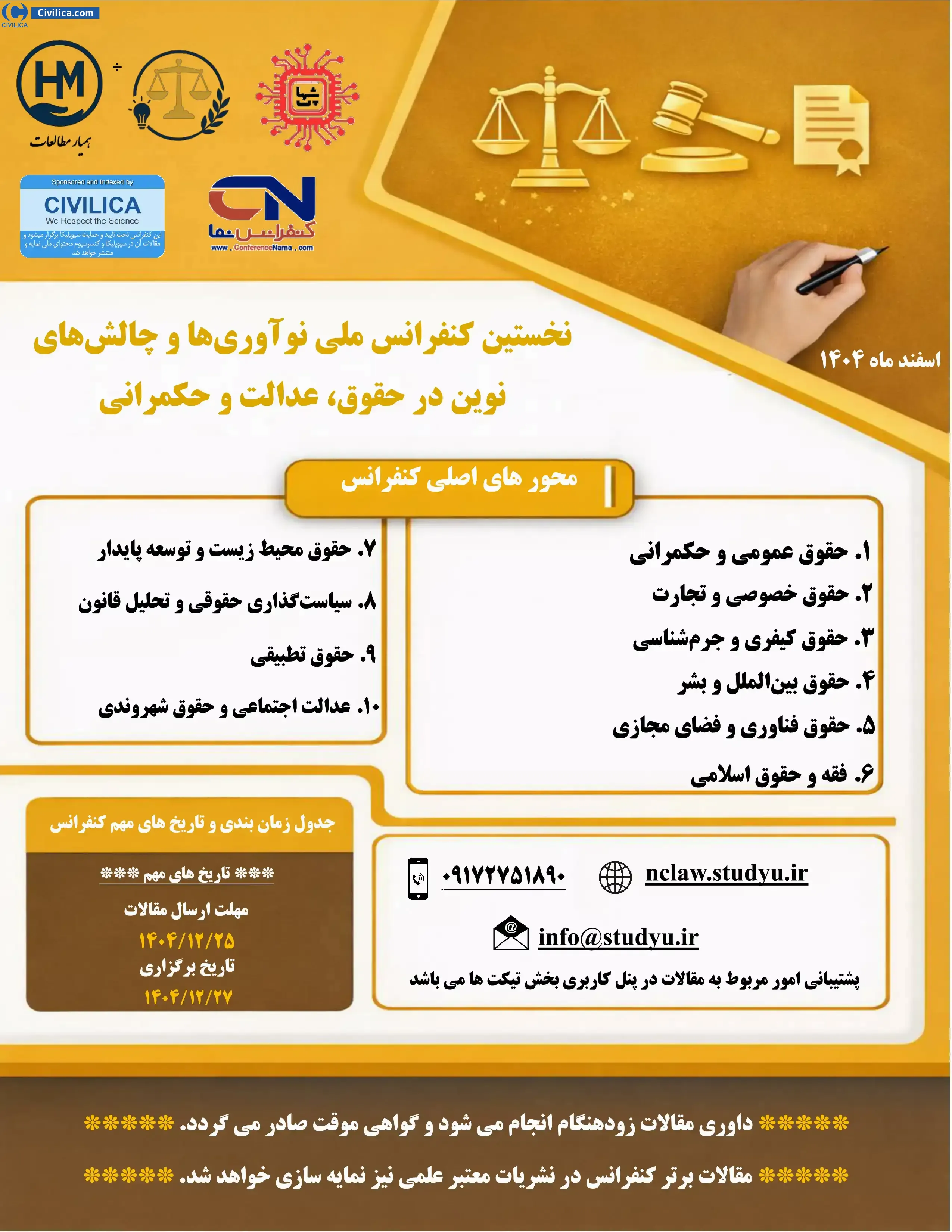 The First National Conference on Innovations and New Challenges in Law, Justice and Governance In date 2026-03-18 by ,مرکز مطالعات شرکت شبکه بندی هوش الکترونیک پیشرفته in City Shiraz will be held.Since the conference held officially, all of this Conference paper and proceedings will be indexed in the Civilica database and Iranian Consortium of National Content (ICNC) and you can have full confidence.