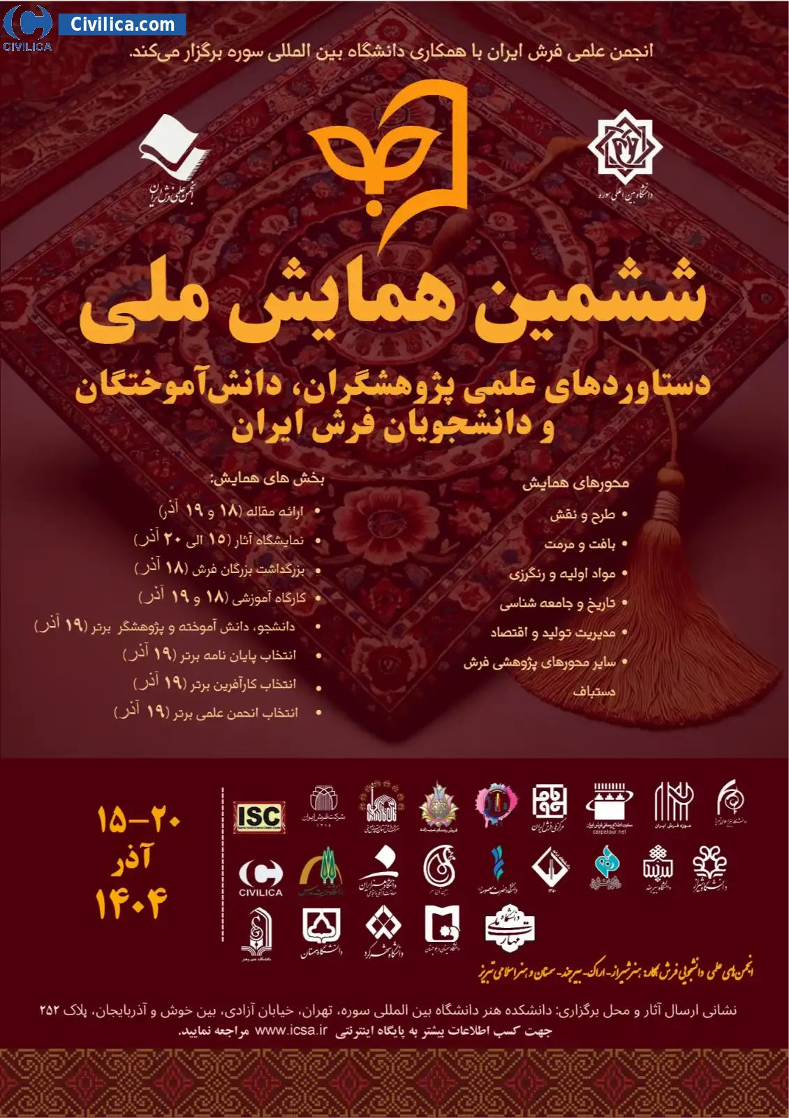 The 6th national conference of scientific achievements of researchers, graduates and students of Farsh Iran In date 2025-12-06 by Soore International University,انجمن علمی فرش ایران in City Tehran will be held.Since the conference held officially, all of this Conference paper and proceedings will be indexed in the Civilica database and Iranian Consortium of National Content (ICNC) and you can have full confidence.