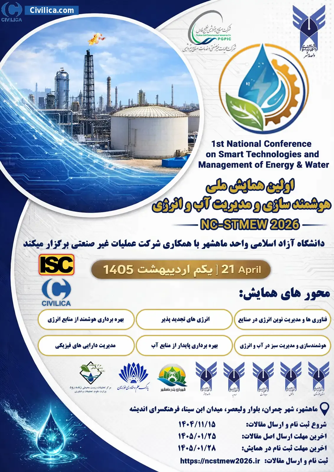 1st National Conference on Smart Technologies and Management of Energy & Water (NC-STMEW 2026) In date 2026-04-21 by Islamic Azad University of Mahshahr, in City Mahshahr will be held.Since the conference held officially, all of this Conference paper and proceedings will be indexed in the Civilica database and Iranian Consortium of National Content (ICNC) and you can have full confidence.