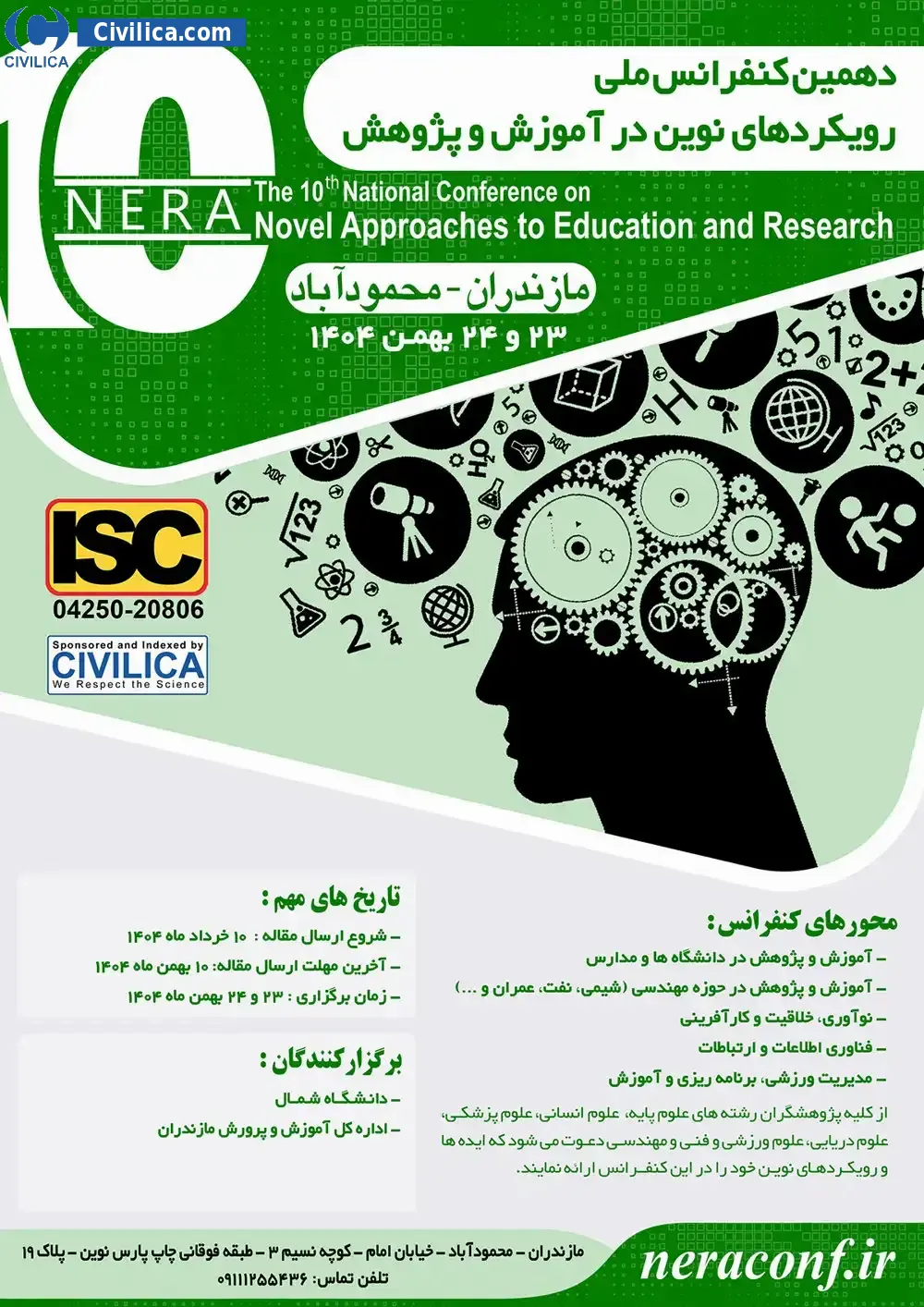 the 10 national conference on Novel approaches to education and research In date 2026-02-19 by Shomal University, in City Mahmudabad will be held.Since the conference held officially, all of this Conference paper and proceedings will be indexed in the Civilica database and Iranian Consortium of National Content (ICNC) and you can have full confidence.