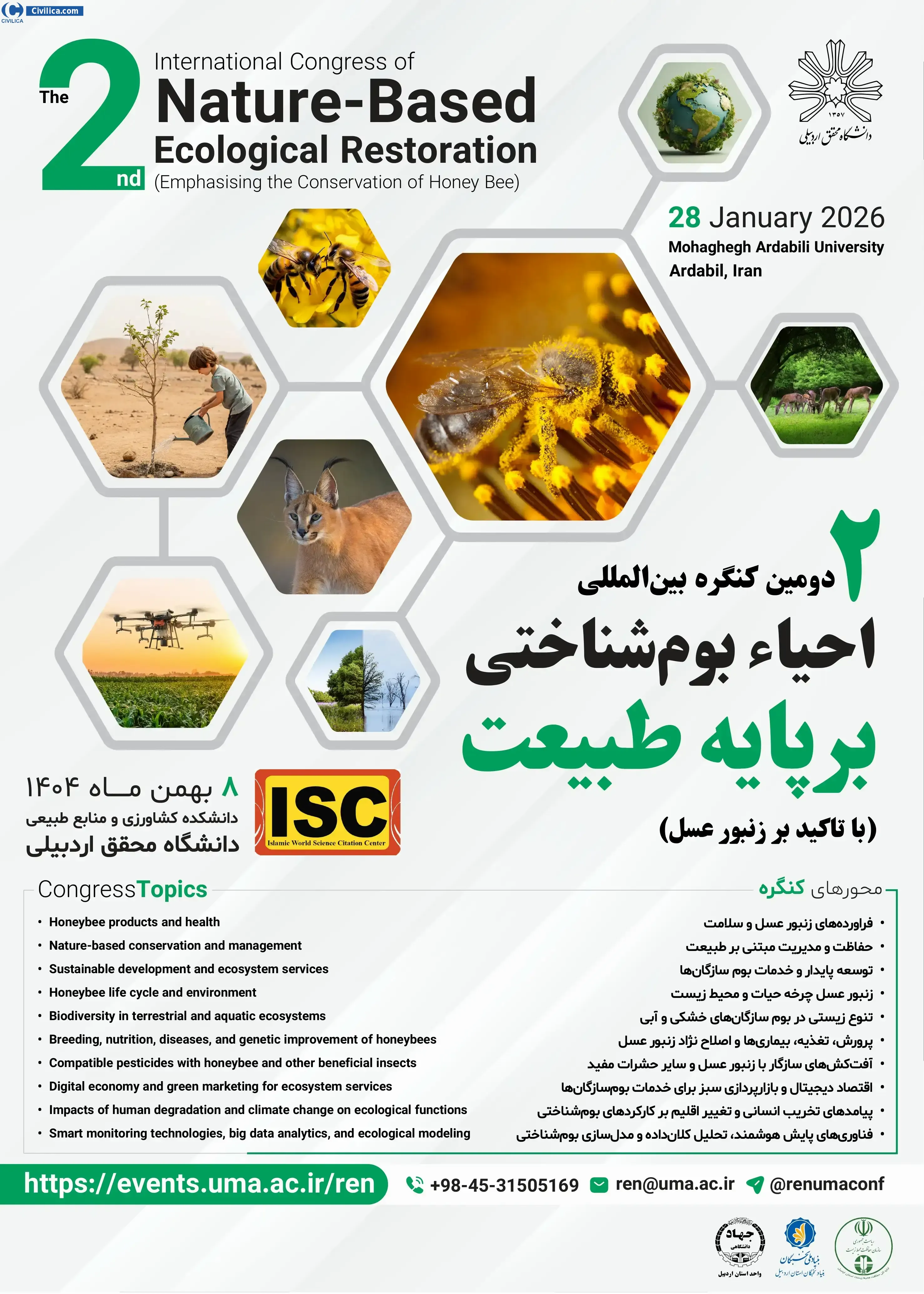 The 2nd International Congress of Nature-Based Ecological Restoration (Emphasising the Conservation of Honey Bee) In date 2026-01-28 by University of Mohaghegh Ardabili, in City Ardabil will be held.Since the conference held officially, all of this Conference paper and proceedings will be indexed in the Civilica database and Iranian Consortium of National Content (ICNC) and you can have full confidence.