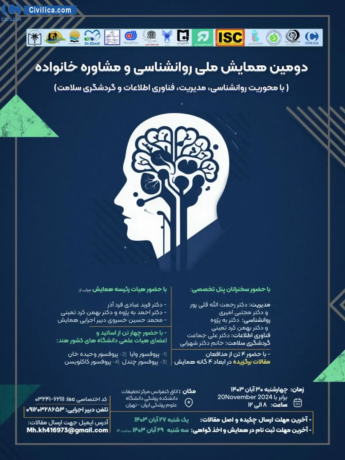 The Second National Conference on Psychology and Family Counseling (Focusing on Psychology, Management, Information Technology, and Health Tourism) In date 2024-11-20 by ,موسسه فرهنگی و هنری مدرسه اولیا با حمایت برخی از دانشگاه هابا همکاری انجمن علمی روانشناسی بهره وری in City Karaj was held. please refer to the following link to download all the papers of conference proceedings: Proceedings The Second National Conference on Psychology and Family Counseling (Focusing on Psychology, Management, Information Technology, and Health Tourism)