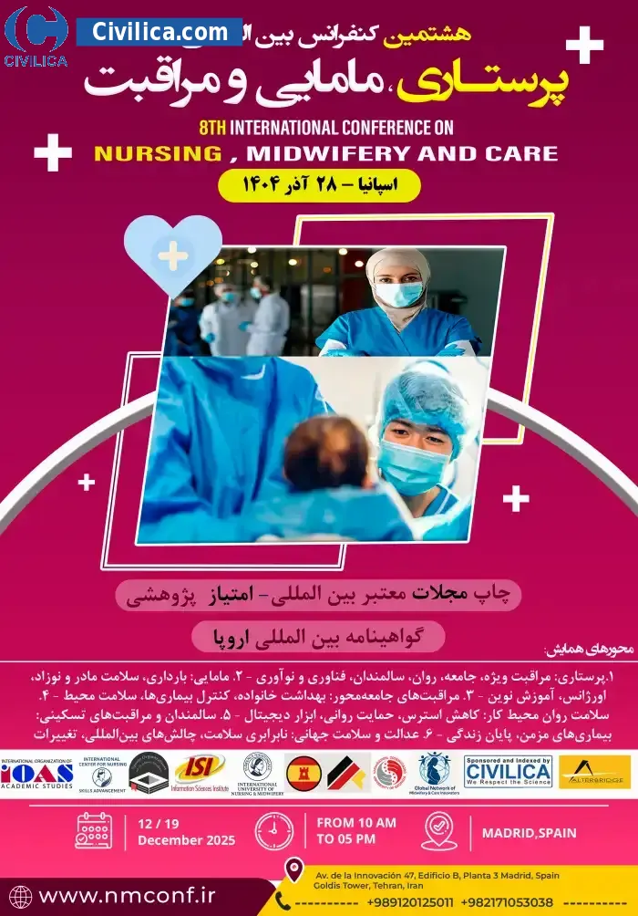 8th International Conference on Nursing, Midwifery and Care In date 2025-12-19 by ,سازمان بین المللی مطالعات دانشگاهی will be held.Since the conference held officially, all of this Conference paper and proceedings will be indexed in the Civilica database and Iranian Consortium of National Content (ICNC) and you can have full confidence.
