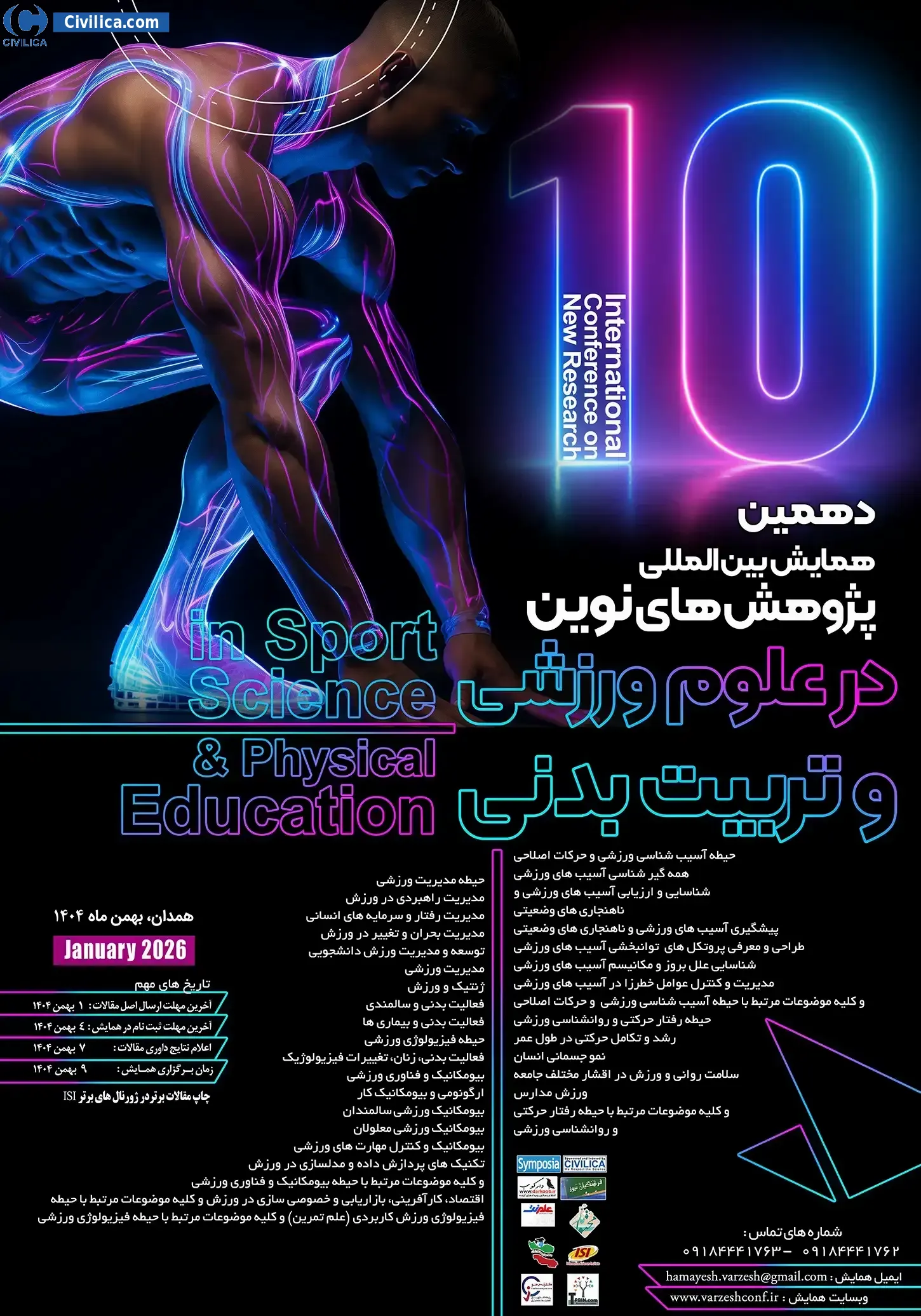 Tenth International Conference on Modern Research in Sport Science and Physical Education In date 2026-01-29 by ,دبیرخانه دائمی کنفرانس in City Hamadan will be held.Since the conference held officially, all of this Conference paper and proceedings will be indexed in the Civilica database and Iranian Consortium of National Content (ICNC) and you can have full confidence.