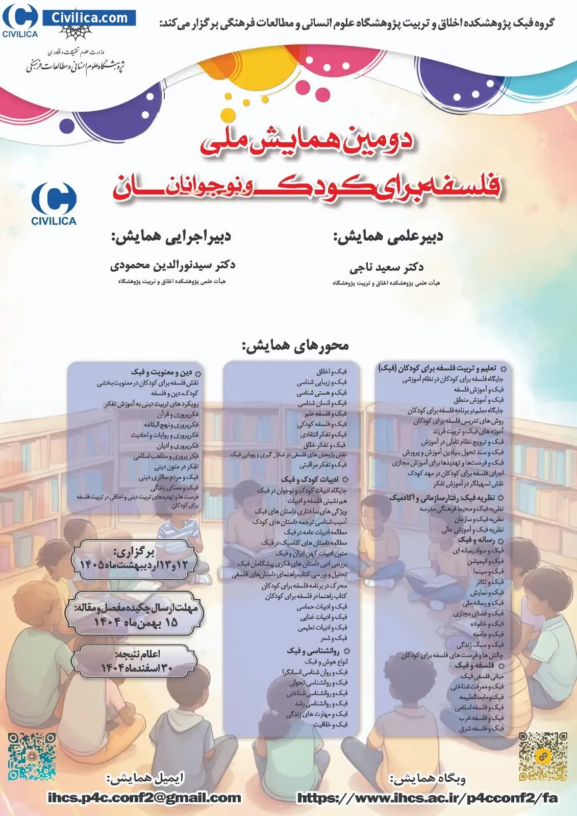 The Second National Conference on Philosophy for Children and Adolescents In date 2026-05-02 by Institute for Humanities and Cultural Studies, in City Tehran will be held.Since the conference held officially, all of this Conference paper and proceedings will be indexed in the Civilica database and Iranian Consortium of National Content (ICNC) and you can have full confidence.