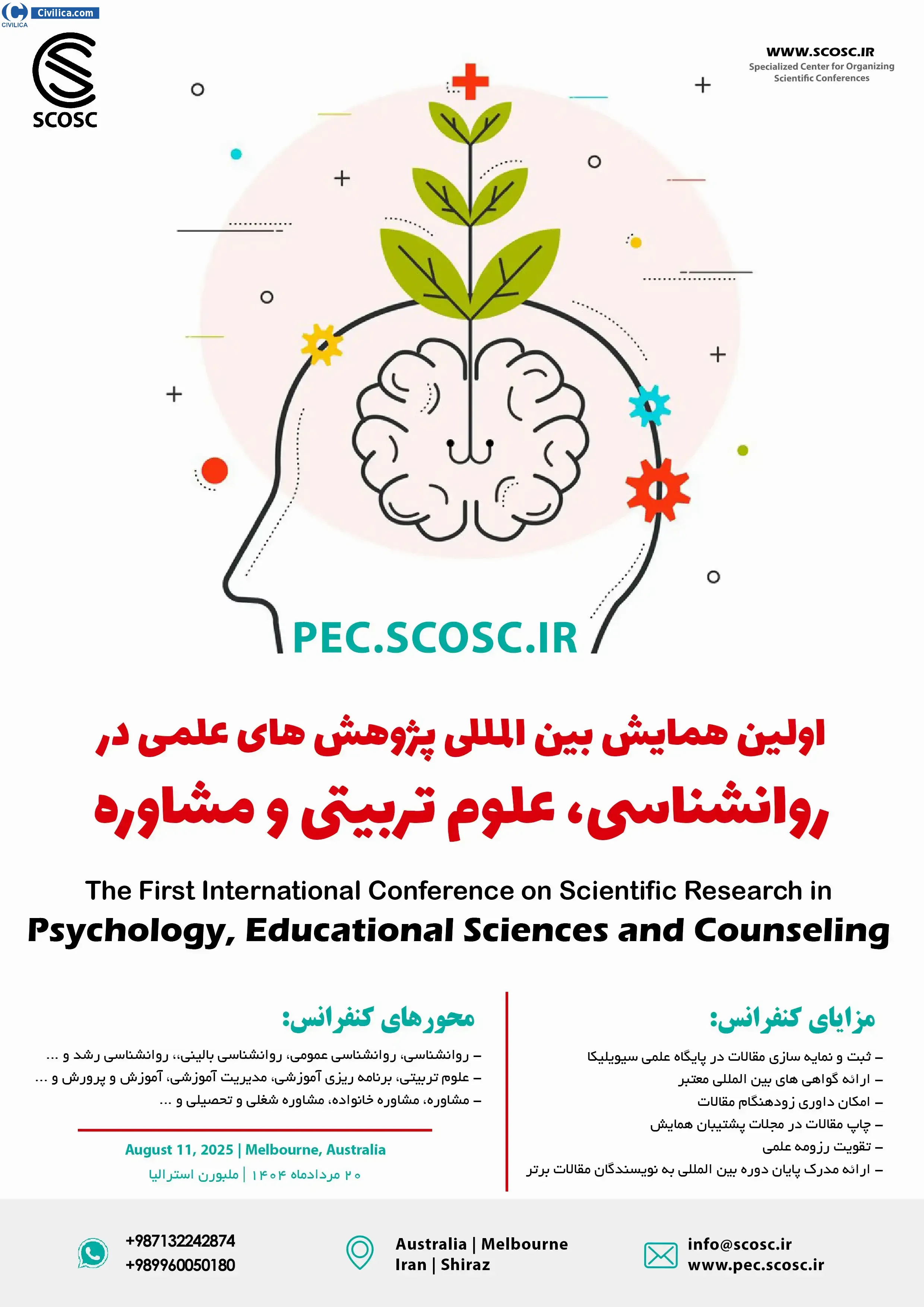 The first international conference on scientific research in psychology, educational sciences and counseling In date 2025-08-11 by ,مرکز تخصصی برگزاری همایش ها was held. please refer to the following link to download all the papers of conference proceedings: Proceedings The first international conference on scientific research in psychology, educational sciences and counseling