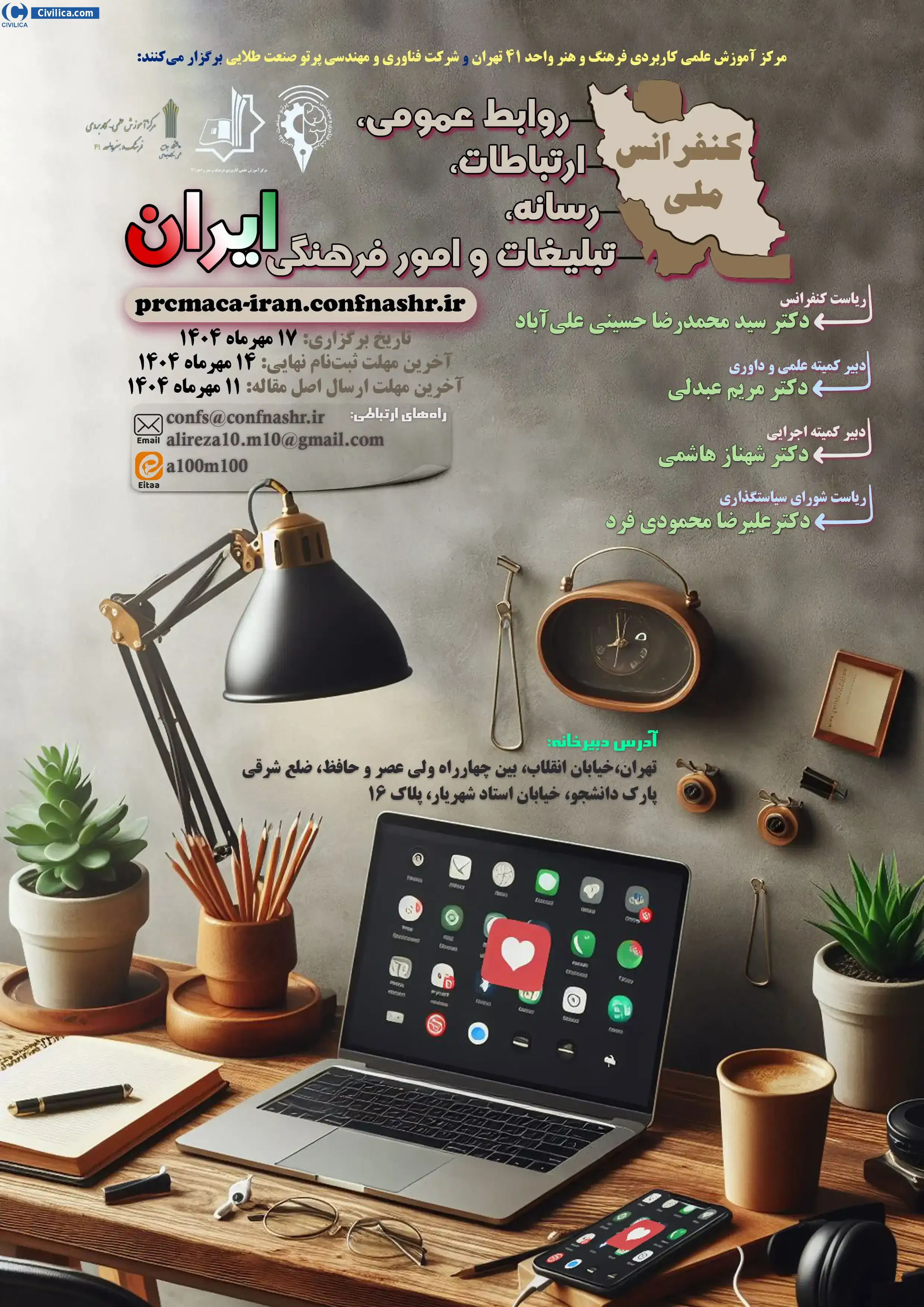 National Conference on Public Relations, Communications, Media, Advertising and Cultural Affairs of Iran In date 2025-10-09 by ,مرکز آموزش علمی کاربردی فرهنگ و هنر واحد 41 تهران و شرکت فناوری و مهندسی پرتو صنعت طلاییآسان وب in City Tehran was held.This conference is held by Civilica Sponsoring and articles and will be indexed in CIVILICA