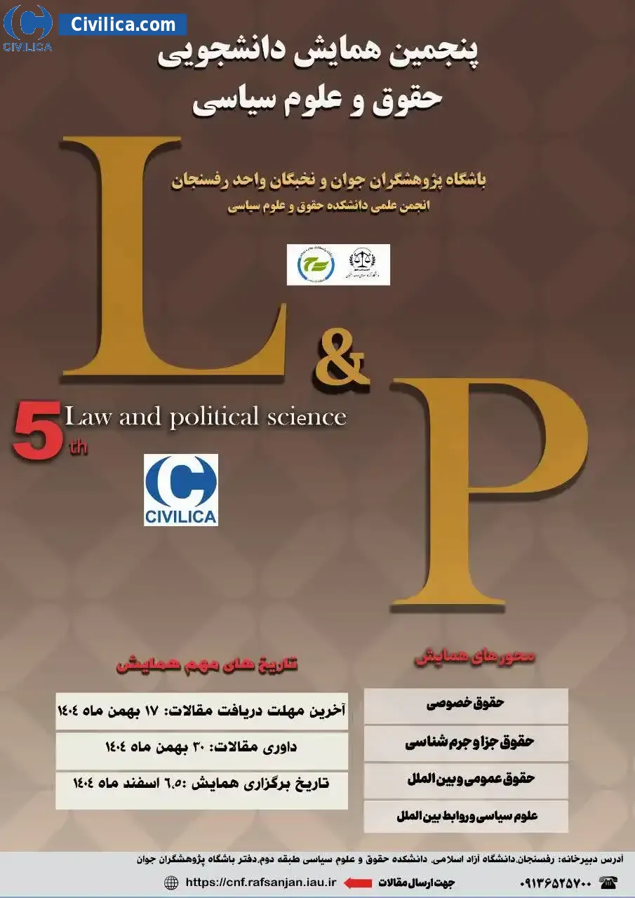 The Fifth Student Conference on Law and Political Science In date 2026-02-24 by Islamic Azad University of Rafsanjan, in City Rafsanjan will be held.Since the conference held officially, all of this Conference paper and proceedings will be indexed in the Civilica database and Iranian Consortium of National Content (ICNC) and you can have full confidence.