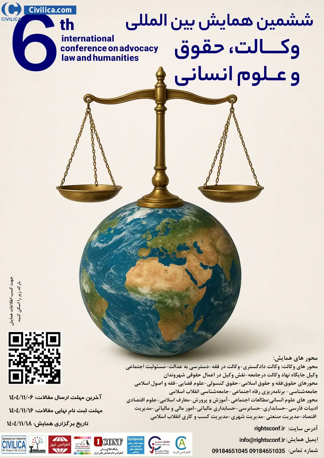 6th International Conference on Advocacy, Law and Humanities In date 2026-02-07 by ,دبیرخانه دائمی همایش in City Hamadan will be held.Since the conference held officially, all of this Conference paper and proceedings will be indexed in the Civilica database and Iranian Consortium of National Content (ICNC) and you can have full confidence.