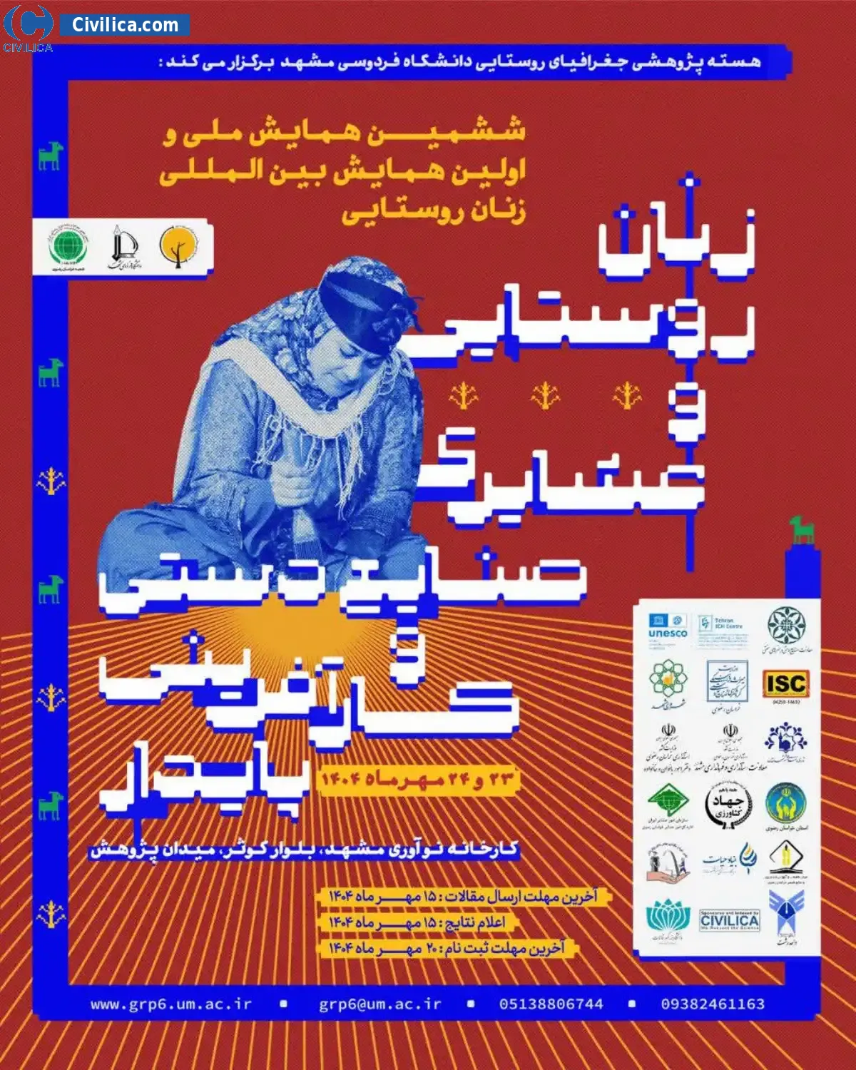 The Sixth National Conference and the First International Conference on Rural and Nomadic Women, Handicrafts and Sustainable Entrepreneurship In date 2025-10-15 by Ferdowsi University of Mashhad,Geography and Rural Planning Association of Iranهسته پژوهشی مطالعات جغرافیای روستایی in City Mashhad was held.This conference is held by Civilica Sponsoring and articles and will be indexed in CIVILICA