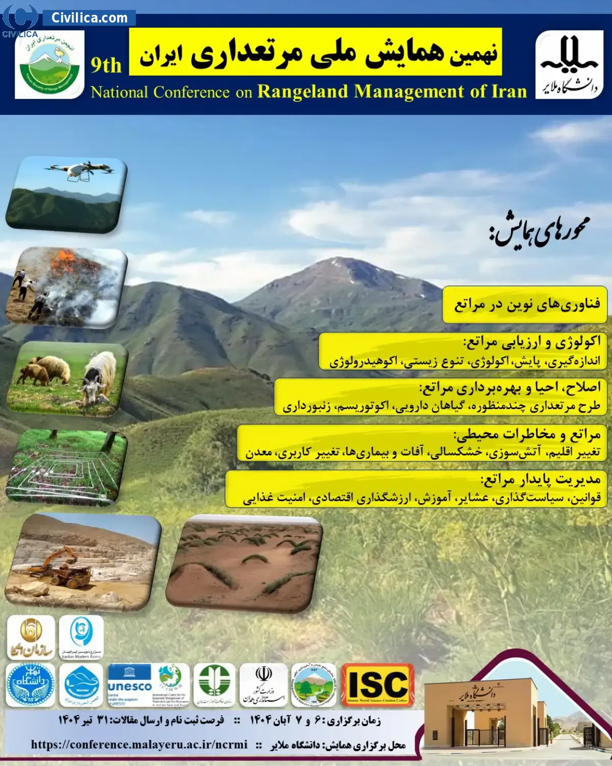 The 9th National Pasture Conference in Iran In date 2025-10-28 by ,انجمن علمی مرتعداری ایران in City Malayer was held.This conference is held by Civilica Sponsoring and articles and will be indexed in CIVILICA