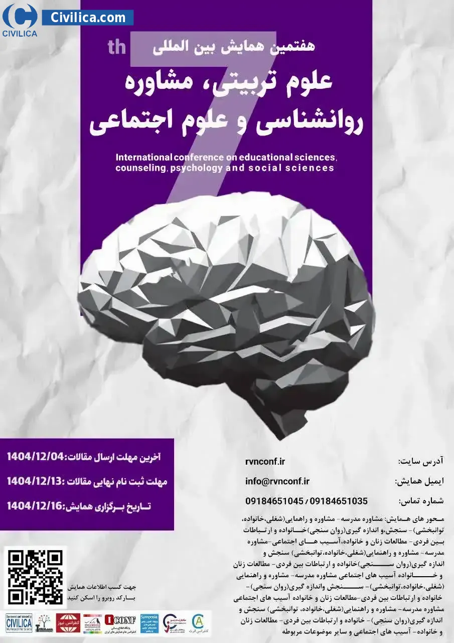 7th International Conference on Educational Sciences, Counseling, Psychology and Social Sciences In date 2026-03-07 by ,دبیرخانه دائمی همایش in City Hamadan will be held.Since the conference held officially, all of this Conference paper and proceedings will be indexed in the Civilica database and Iranian Consortium of National Content (ICNC) and you can have full confidence.
