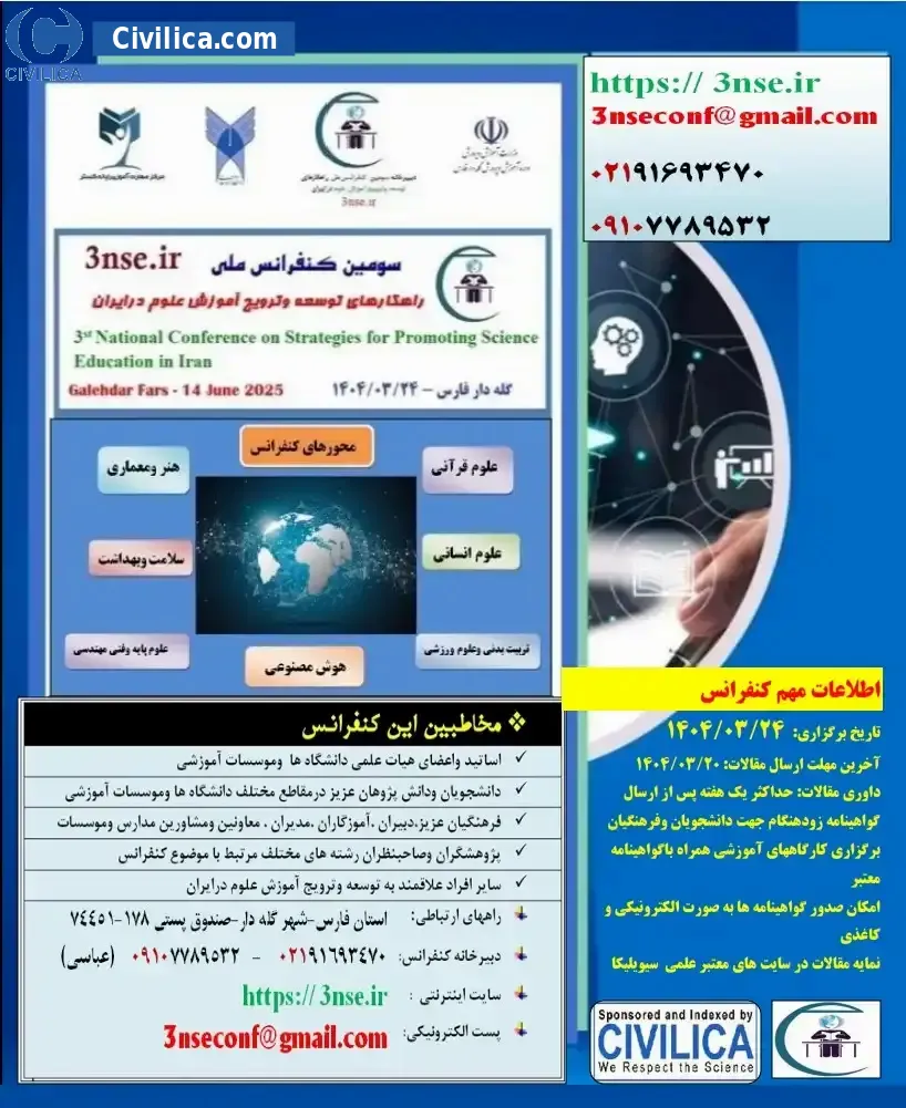 3stNational Conference on strategies for promoting science education in Iran In date 2025-06-14 by ,دانشگاههای آزادو آموزش وپرورش گله دارو مرکز مهارت آموزی ومجامع ومراکز علمی آموزشی ودانشگاهی in City Galleh dar was held. please refer to the following link to download all the papers of conference proceedings: Proceedings 3stNational Conference on strategies for promoting science education in Iran