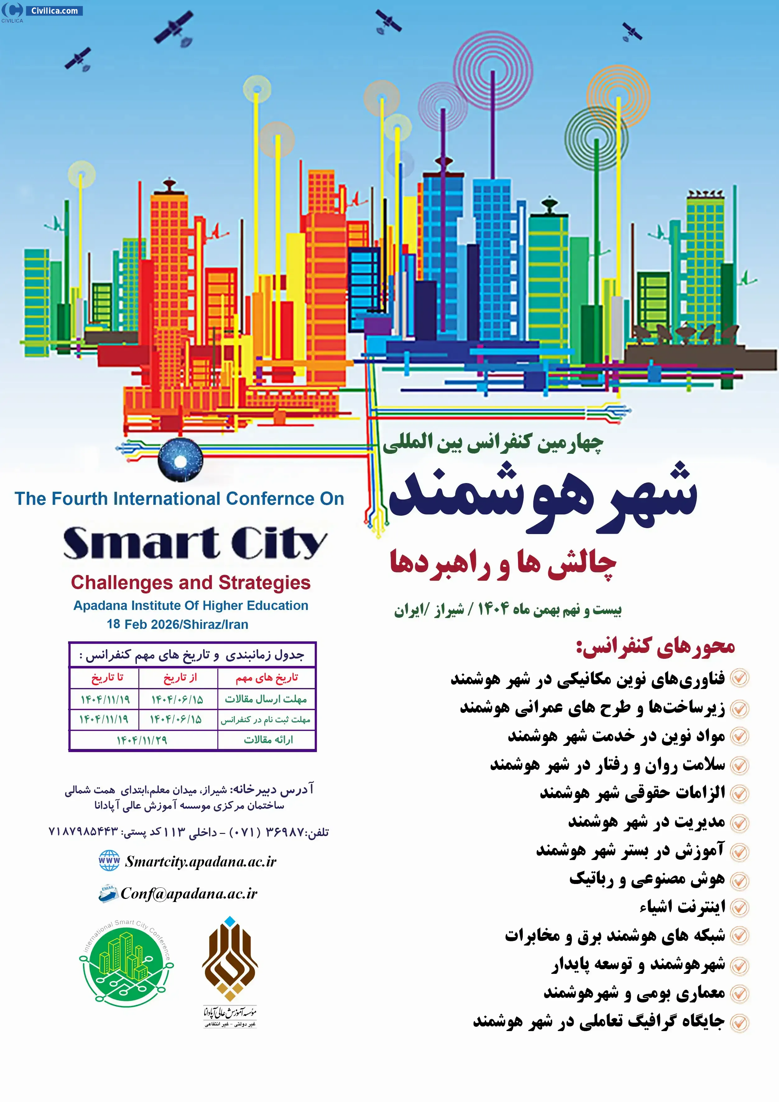 The Fourth International Conference on Smart City, Challenges and Strategies In date 2026-02-18 by Institute of Higher Education Apadana, in City Shiraz will be held.Since the conference held officially, all of this Conference paper and proceedings will be indexed in the Civilica database and Iranian Consortium of National Content (ICNC) and you can have full confidence.