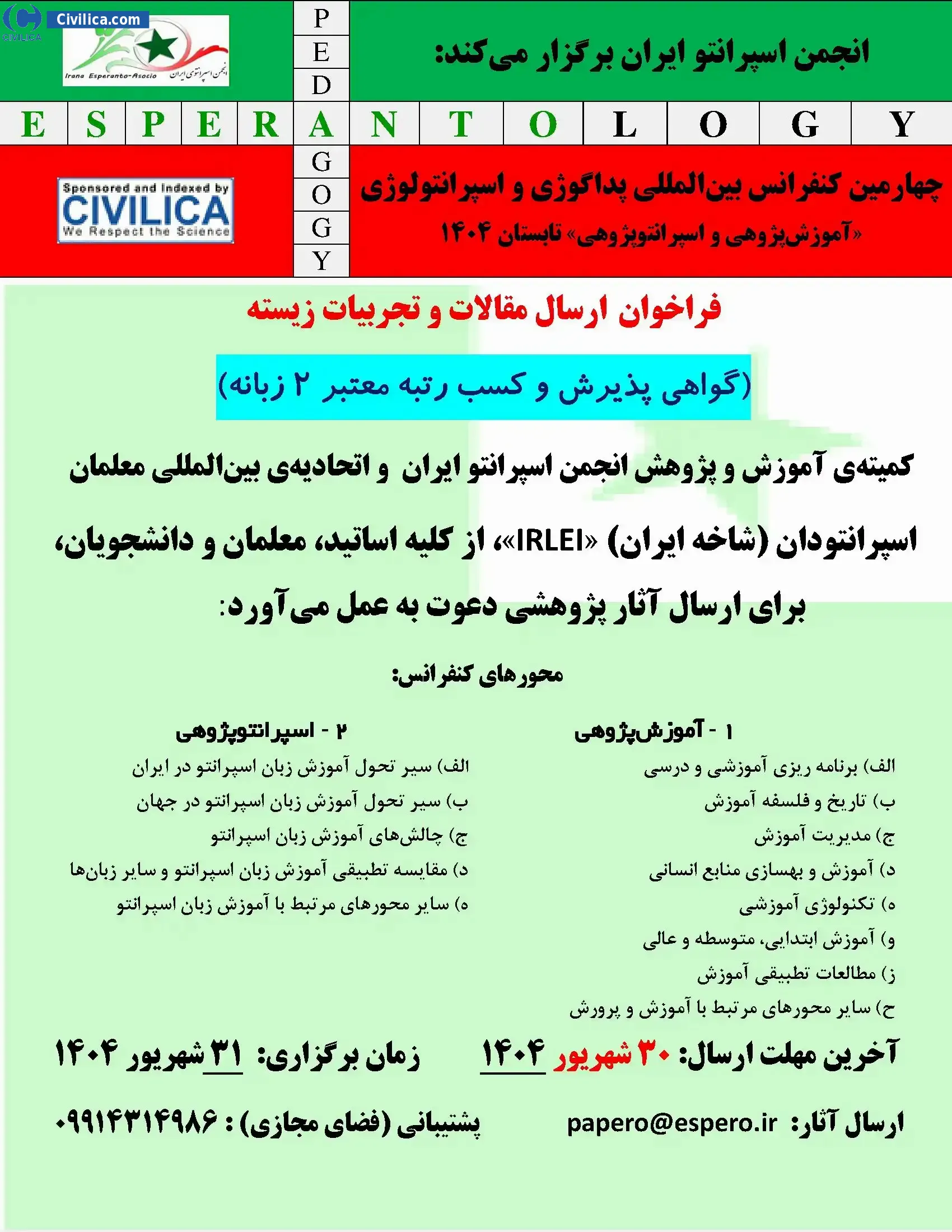 The Fourth International Conference on Pedagogy and Esperantology, Summer 1404 In date 2025-09-22 by ,انجمن اسپرانتو ایران (کمیته آموزش و پژوهش) in City Tehran was held. please refer to the following link to download all the papers of conference proceedings: Proceedings The Fourth International Conference on Pedagogy and Esperantology, Summer 1404