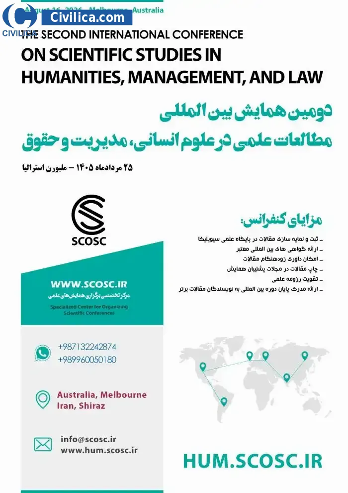 The Second International Conference on Scientific Studies in Humanities, Management and Law In date 2026-08-16 by ,مرکز تخصصی برگزاری همایش ها will be held.Since the conference held officially, all of this Conference paper and proceedings will be indexed in the Civilica database and Iranian Consortium of National Content (ICNC) and you can have full confidence.