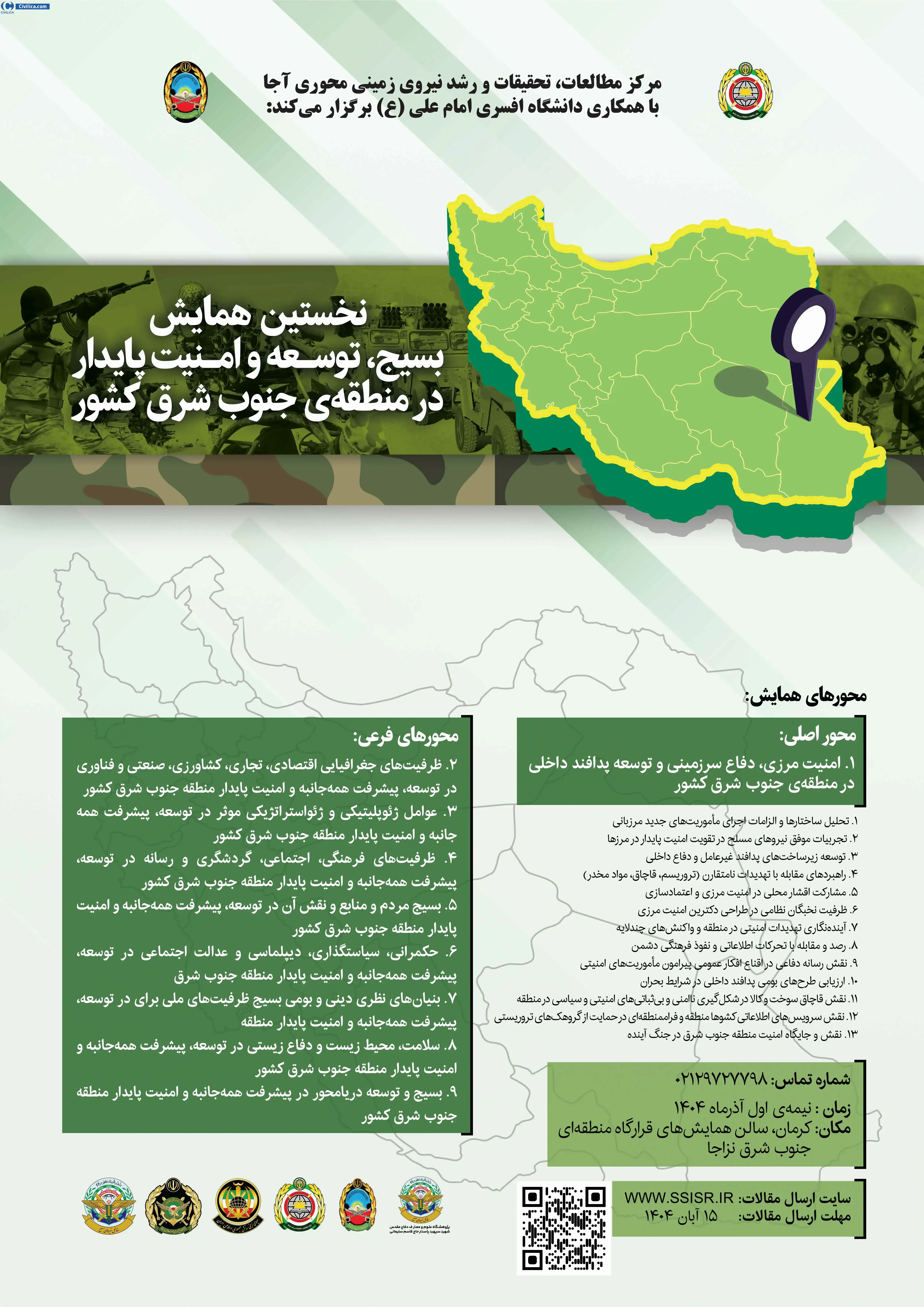 The first conference on mobilization, development and sustainable security in the southeastern region of the country In date 2025-12-21 by Imam Ali University, in City Tehran will be held.Since the conference held officially, all of this Conference paper and proceedings will be indexed in the Civilica database and Iranian Consortium of National Content (ICNC) and you can have full confidence.