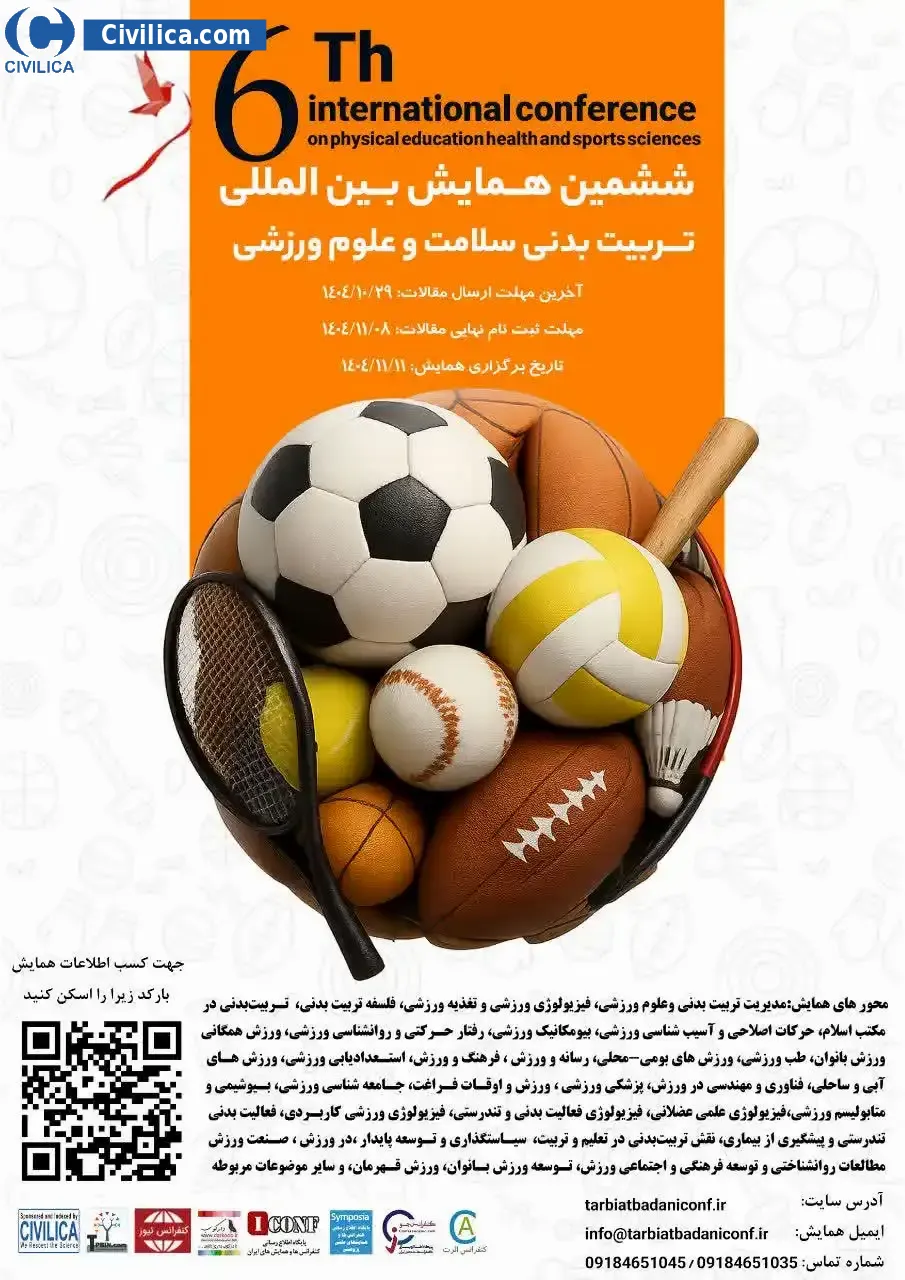 6th International Conference on Physical Education, Health and Sports Sciences In date 2026-01-31 by ,دبیرخانه دائمی همایش in City Hamadan will be held.Since the conference held officially, all of this Conference paper and proceedings will be indexed in the Civilica database and Iranian Consortium of National Content (ICNC) and you can have full confidence.