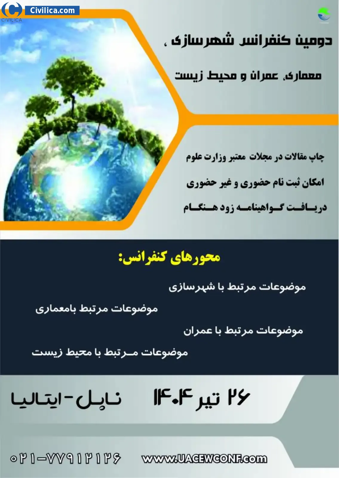 The Second International Conference on Urban Planning, Architecture, Civil Engineering and Environment In date 2025-07-17 by ,دبیرخانه دائمی کنفرانس was held. please refer to the following link to download all the papers of conference proceedings: Proceedings The Second International Conference on Urban Planning, Architecture, Civil Engineering and Environment