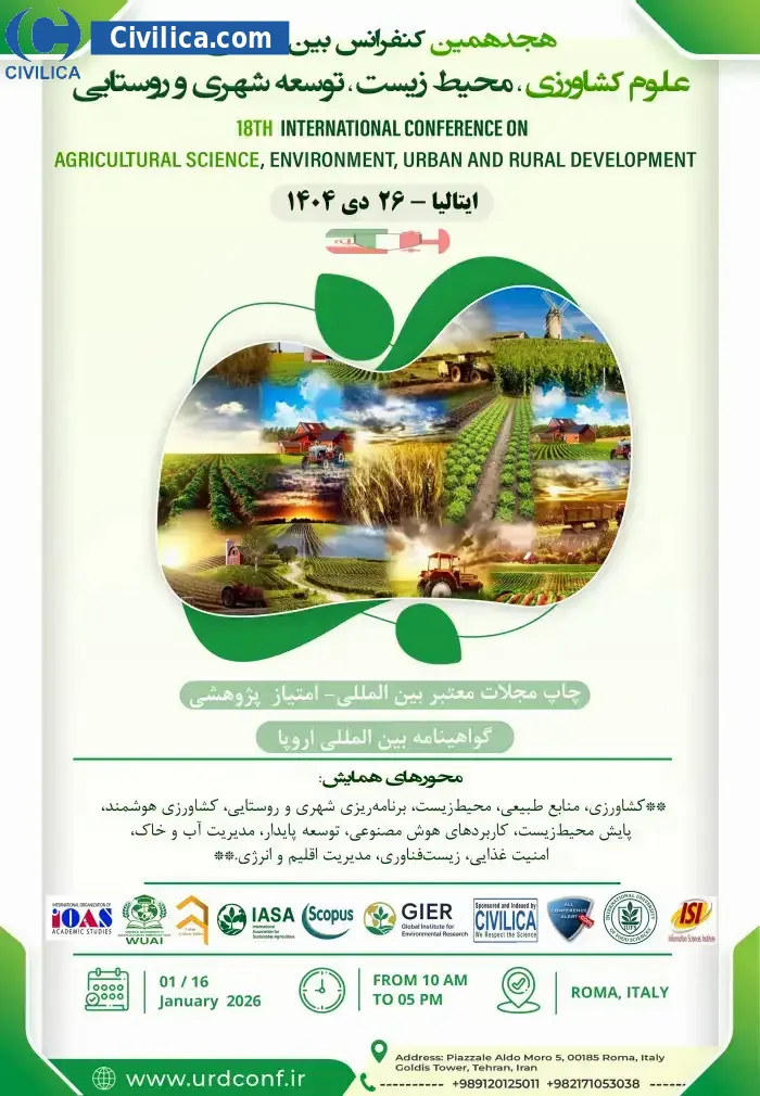 18th International Conference on Agricultural Science, Environment, Urban and Rural Development In date 2026-01-16 by ,سازمان بین المللی مطالعات دانشگاهی will be held.Since the conference held officially, all of this Conference paper and proceedings will be indexed in the Civilica database and Iranian Consortium of National Content (ICNC) and you can have full confidence.