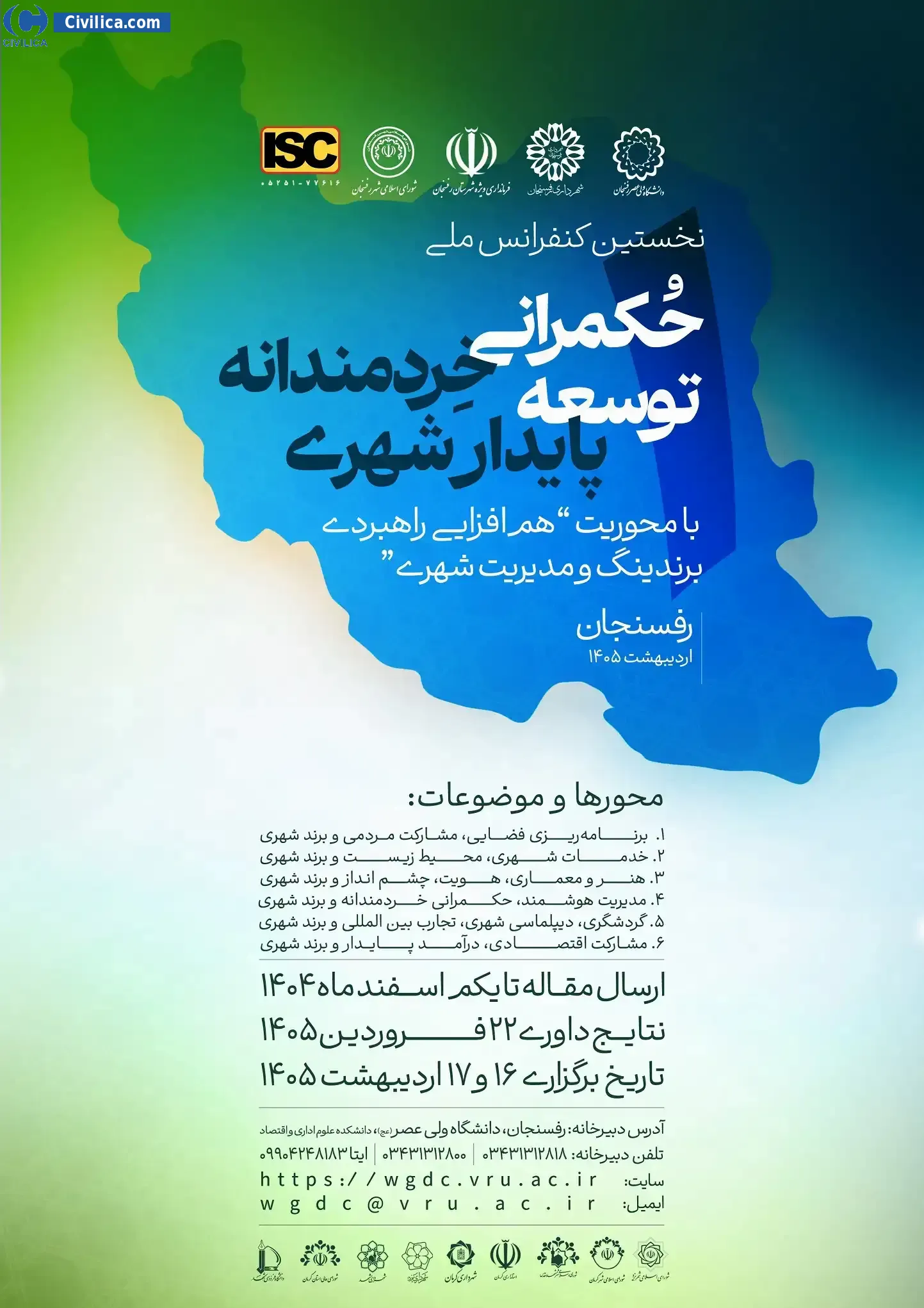 Conference tel: 03431312818Postall Address: فسنجان، میدان امام خمینی، دانشگاه ولی عصر(عج)، دانشکده علوم اداری و اقتصاد- دبیرخانه اولین کنفرانس ملی حکمرانی خردمندانه توسعه پایدار شهری