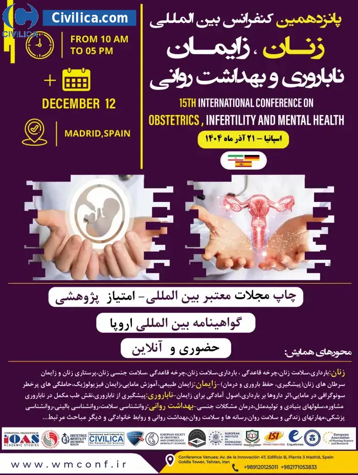 15th International Conference on Ob stetrics, Infertility and Mental health In date 2025-12-12 by ,سازمان بین المللی مطالعات دانشگاهی(International Organization of Academic Studi in City Tehran will be held.Since the conference held officially, all of this Conference paper and proceedings will be indexed in the Civilica database and Iranian Consortium of National Content (ICNC) and you can have full confidence.