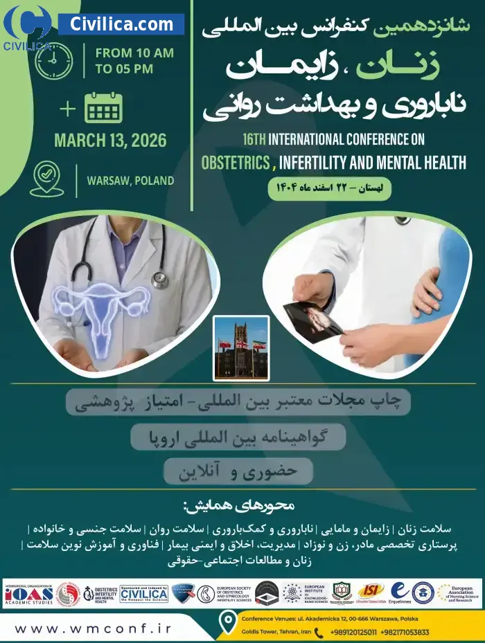16th International Conference on Obstetrics, Infertility and Mental health In date 2026-03-13 by ,سازمان بین المللی مطالعات دانشگاهی( International Organization of Academic Studies ) و مرکز همایش ایران in City Tehran will be held.Since the conference held officially, all of this Conference paper and proceedings will be indexed in the Civilica database and Iranian Consortium of National Content (ICNC) and you can have full confidence.