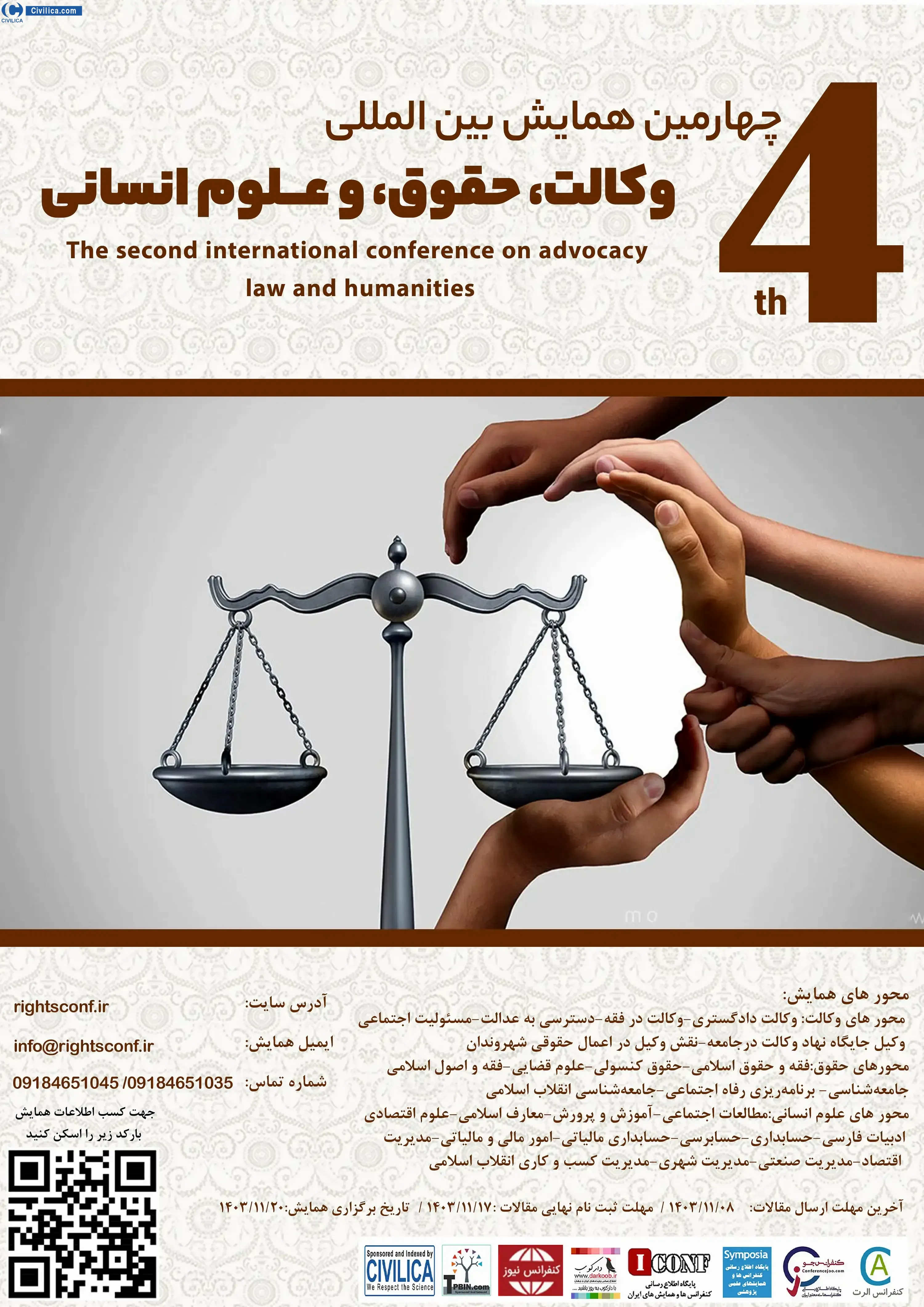 4 th International Conference on Advocacy, Law and Human Sciences In date 2025-02-08 by ,دبیرخانه دائمی همایش in City Hamadan was held. please refer to the following link to download all the papers of conference proceedings: Proceedings 4 th International Conference on Advocacy, Law and Human Sciences